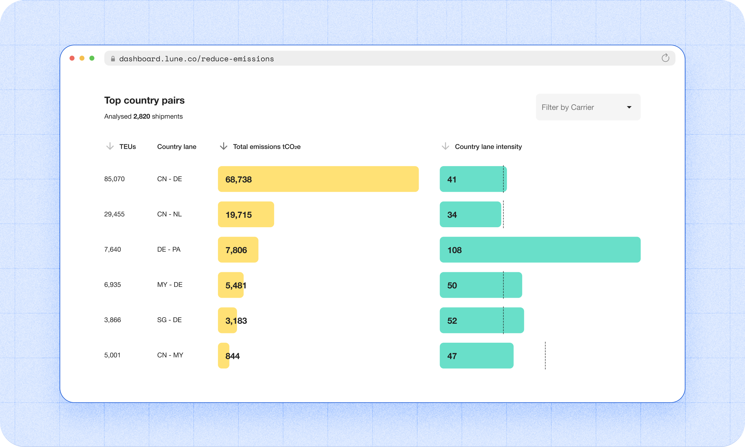 View emissions data broken down by the carriers used for your sea shipments. Sort and filter to explore performance and identify opportunities for optimisation.Top country pairs
